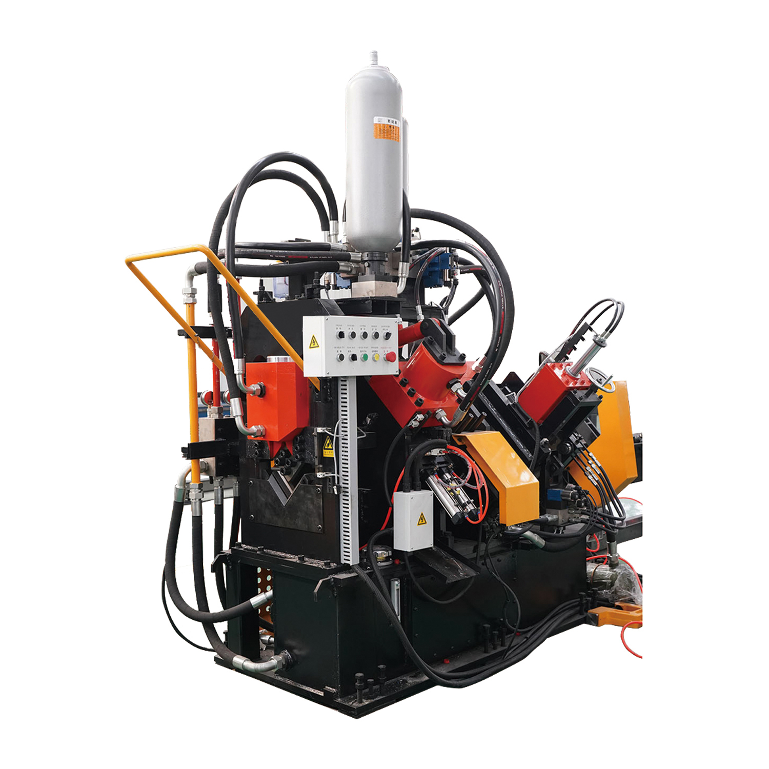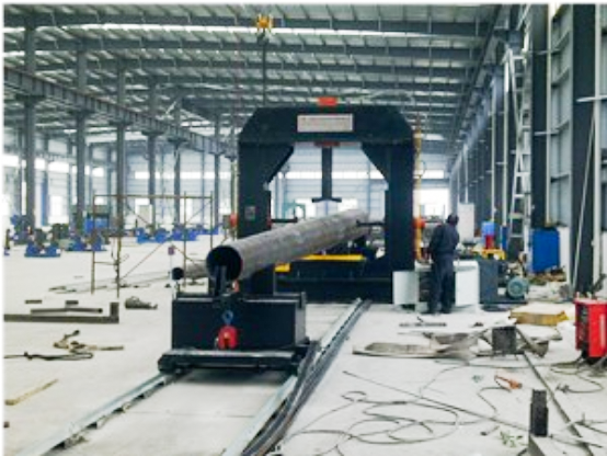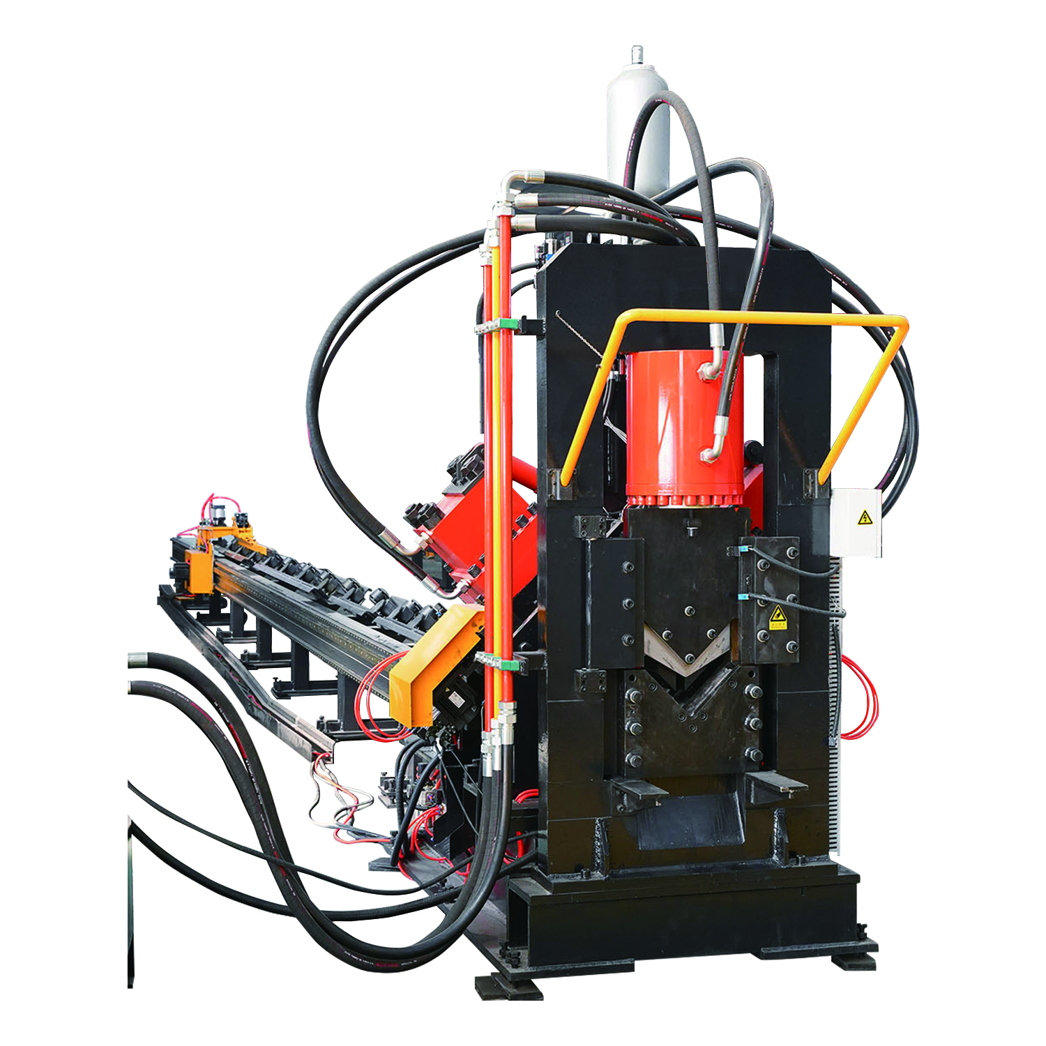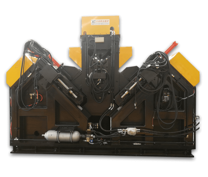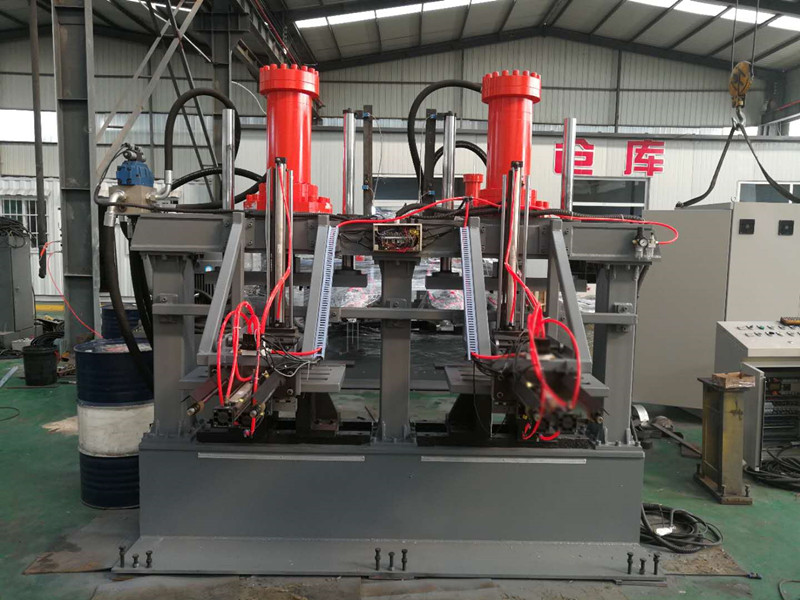 該機(jī)為龍門(mén)式五缸壓力機(jī),可利用前后管支架,對(duì)鋼管進(jìn)行矯直作業(yè),一機(jī)兩用。